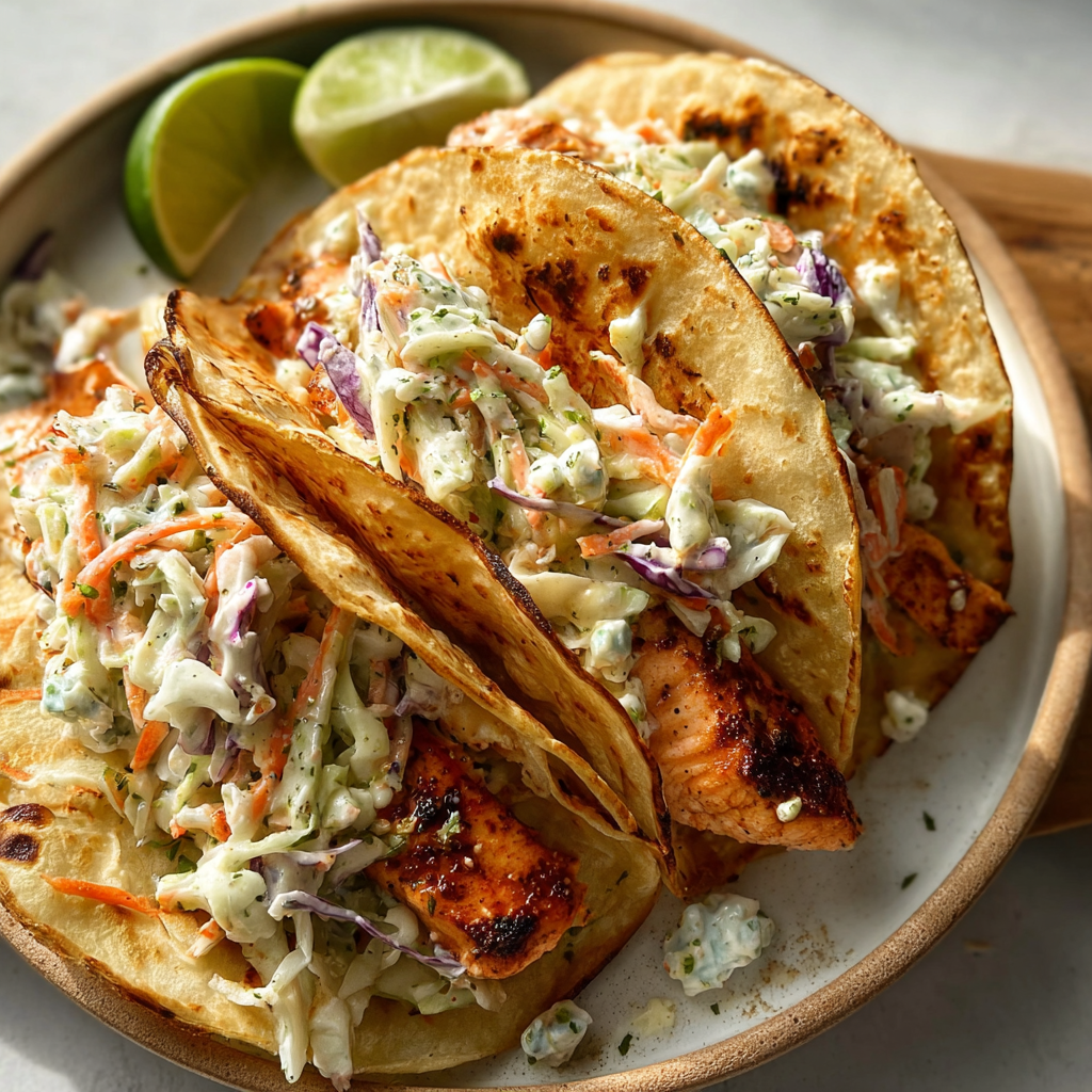 6Assemble the tacos by dividing the salmon and slaw among the tortillas. Serve immediately.