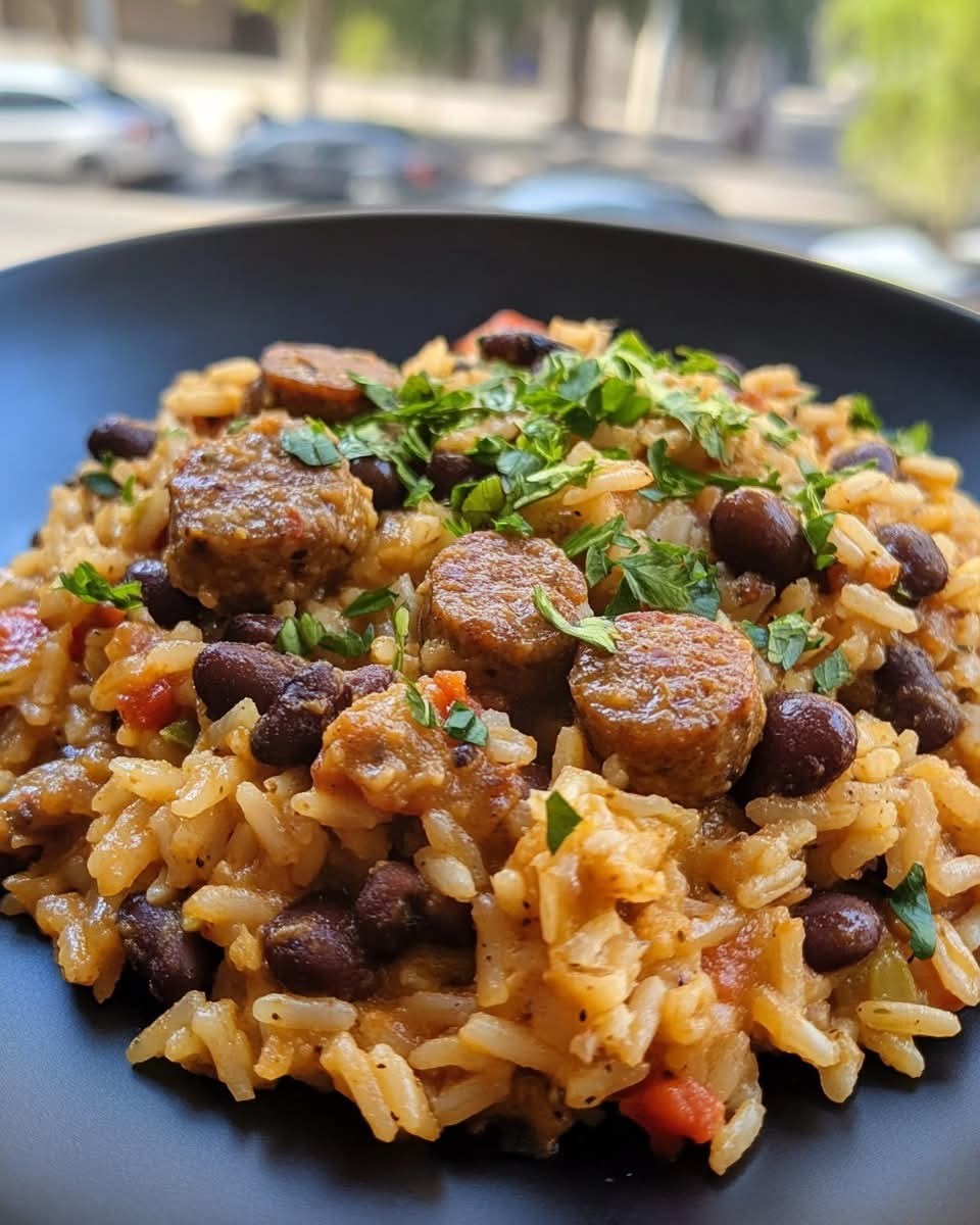 3. Add the rice to the skillet and stir to coat with the sausage and onion mixture. Cook for 1 minute, stirring constantly.