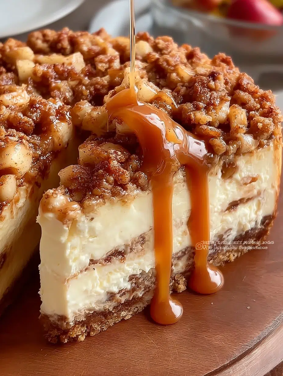 In a skillet, sauté apples with butter, brown sugar, cinnamon, and nutmeg until softened. Cool slightly. In a bowl, mix flour, oats, brown sugar, and cold butter until crumbly. Layer sautéed apples and crumble over cheesecake batter.