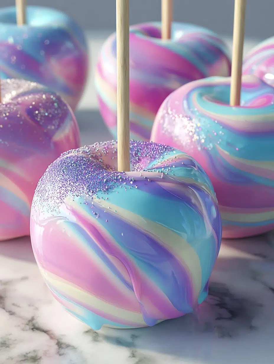 These dreamy candy apples are coated in pastel swirls of pink, blue, and purple with a glossy finish and a touch of edible glitter. Perfect for parties, fairs, or whimsical celebrations, they’re as magical as they are delicious!