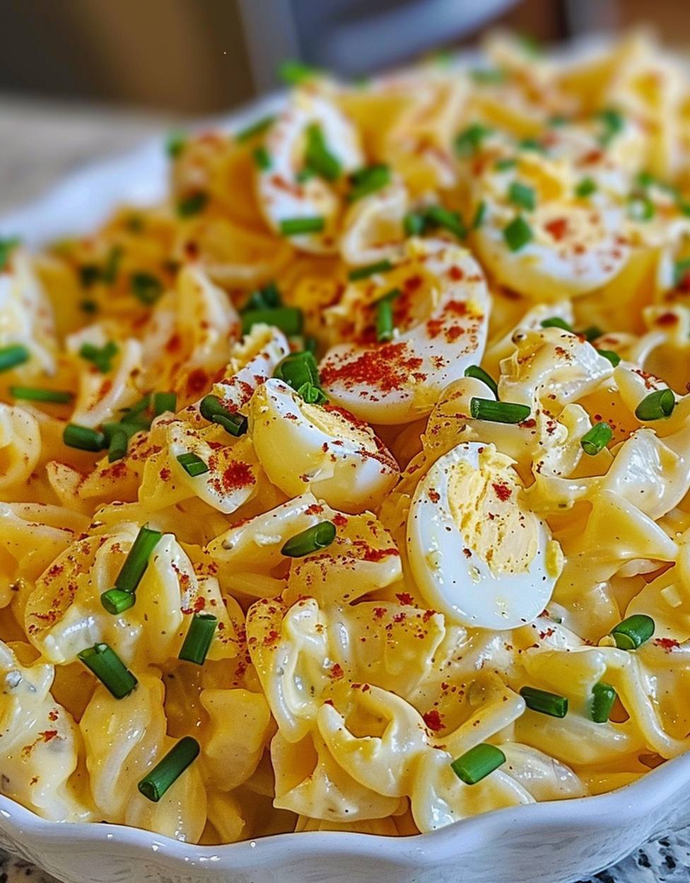 A creamy and flavorful pasta salad that combines the classic taste of deviled eggs with tender pasta for a perfect side dish.