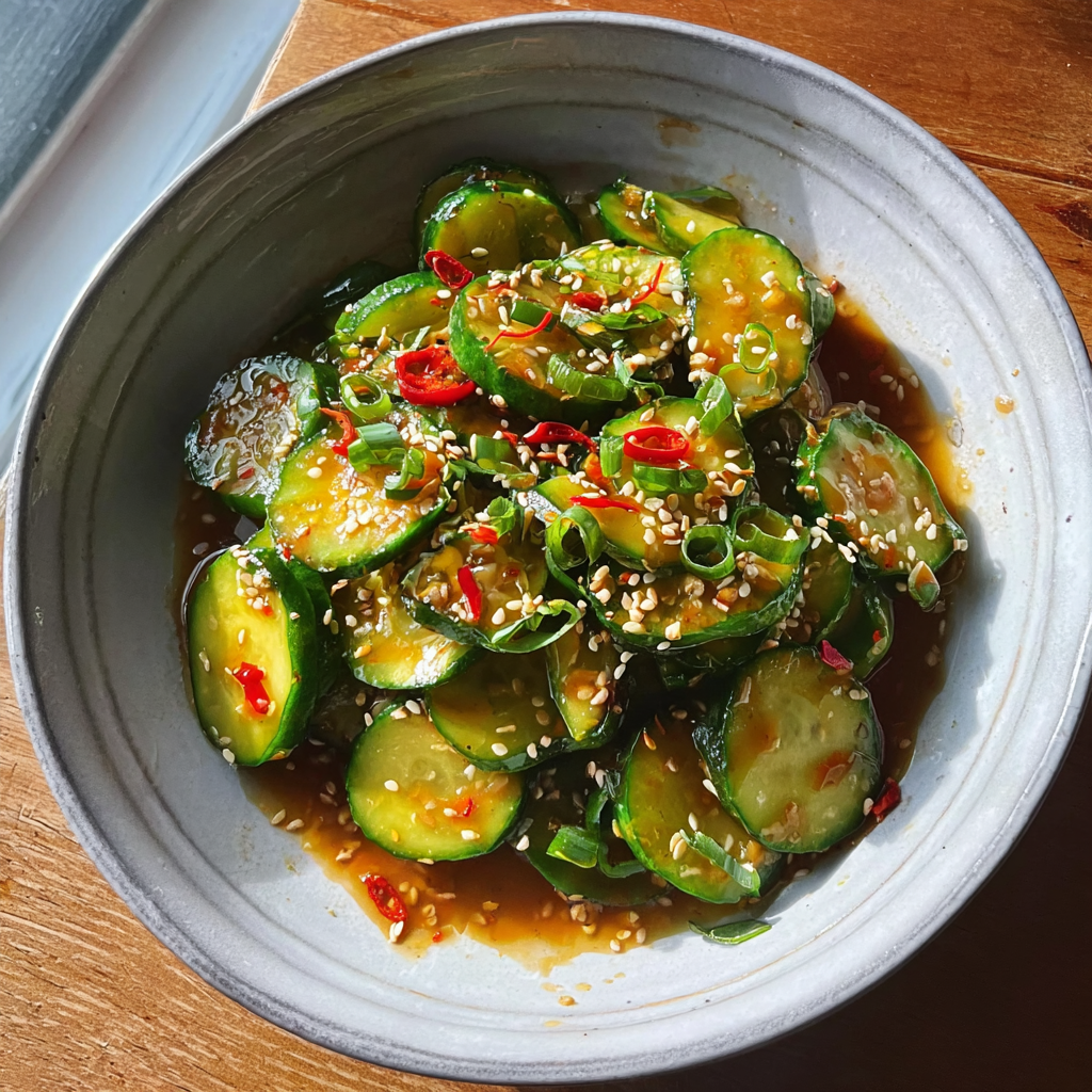 In a bowl, combine drained cucumbers, green onions, sesame seeds, and dressing.