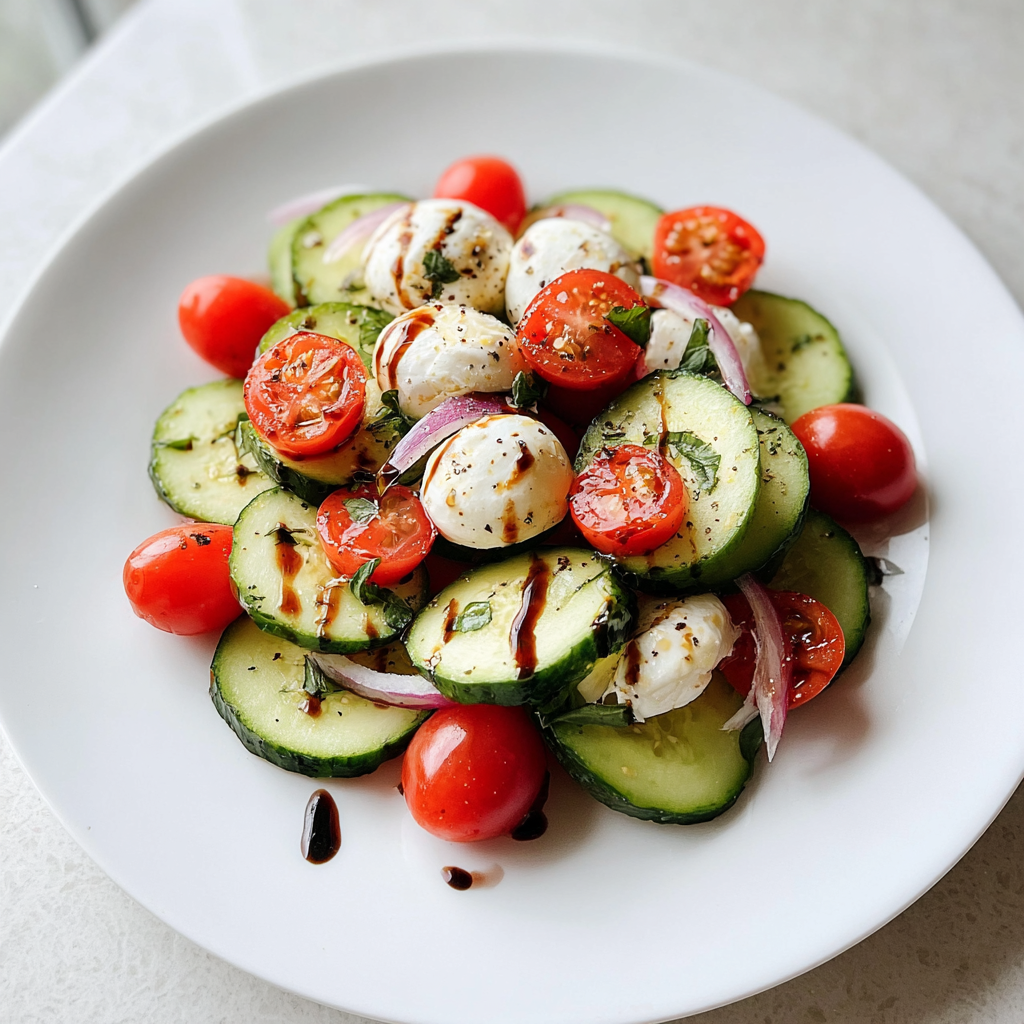 In a large bowl, combine the sliced cucumbers, cherry tomatoes, mozzarella, and basil. -