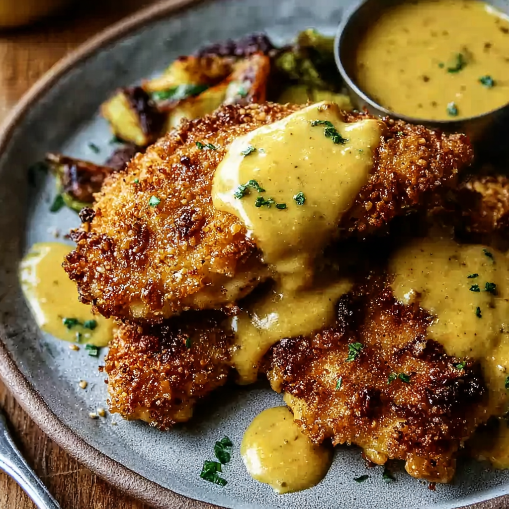 Follow these simple steps to create your Pretzel Chicken with Mustard-Cheddar Sauce: