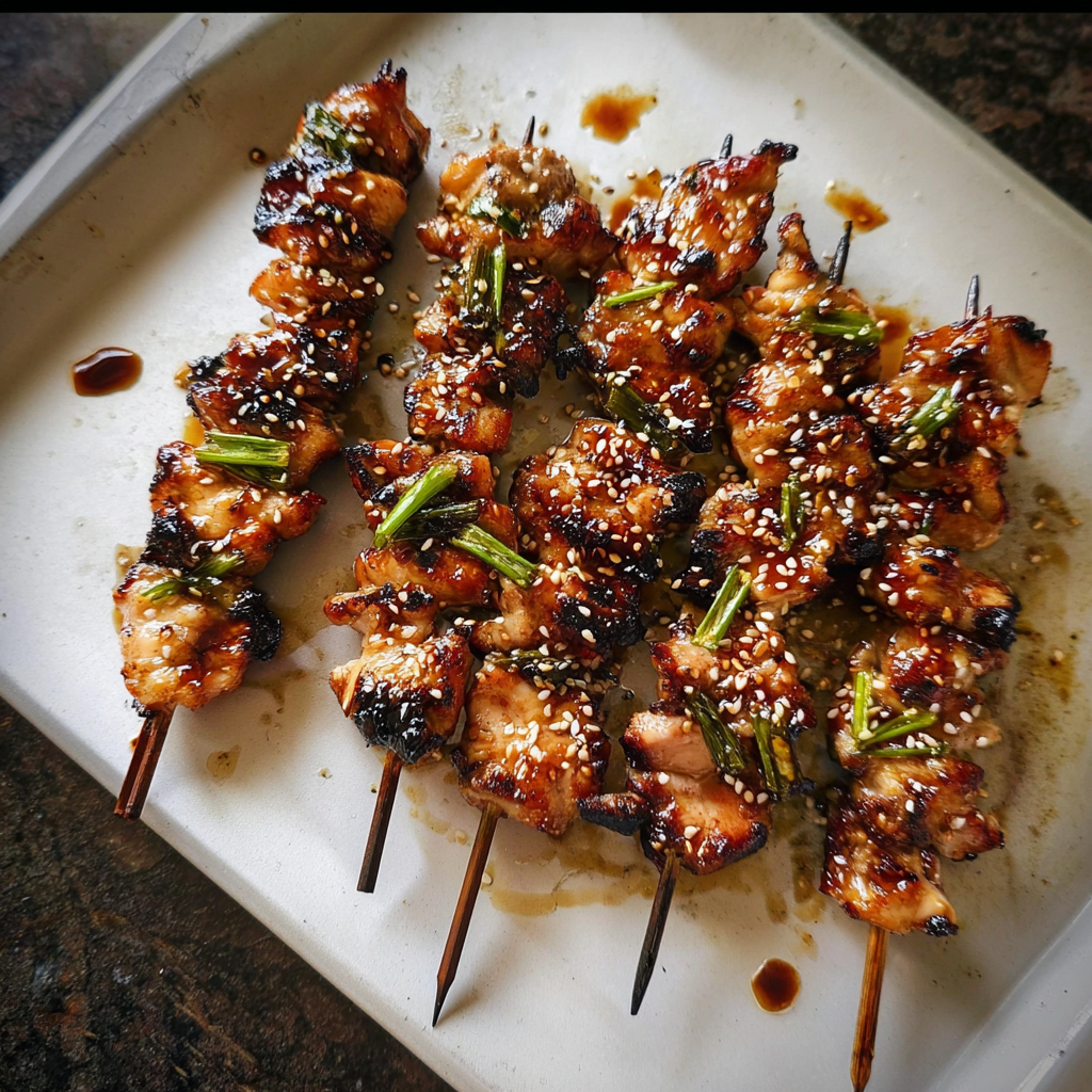 Grill skewers for 3–4 minutes per side, brushing with yakitori sauce frequently during the last few minutes until caramelized and slightly charred.