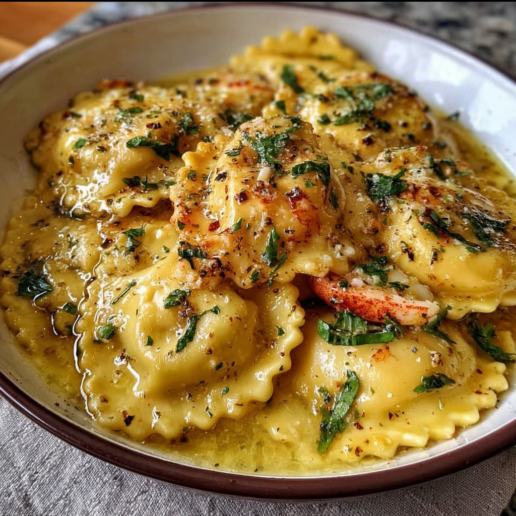 Bring a large pot of salted water to a boil. Cook the lobster ravioli according to package directions until al dente. Reserve 1/4 cup of pasta water, then drain.