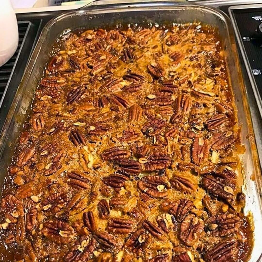 Sprinkle the pecan mixture over the batter in the casserole. It might seem a lot, but it is the perfect quantity for a cobbler. Do not stir the topping in too.