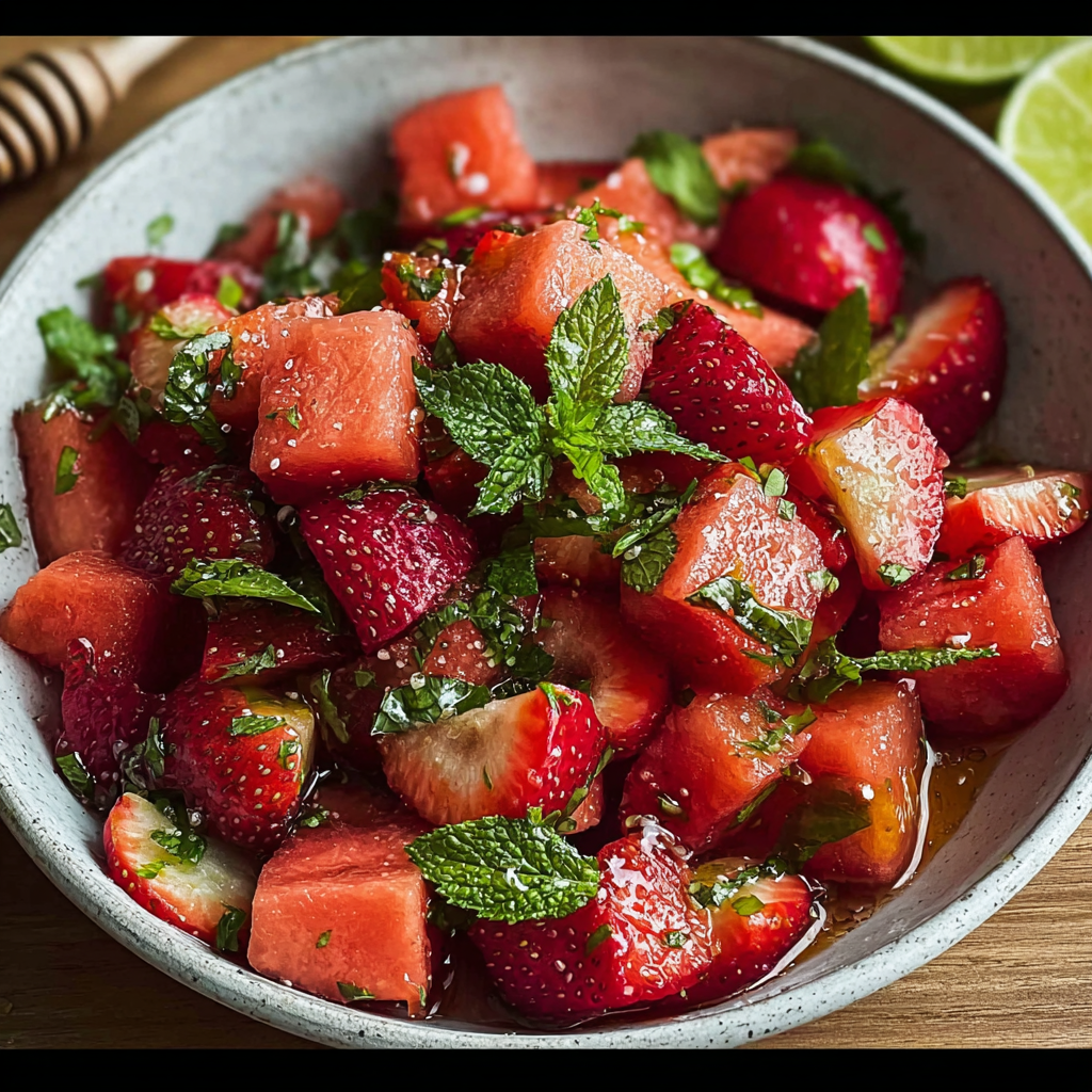 In a large bowl, combine watermelon, strawberries, and cucumber (if using). Gently toss. -
